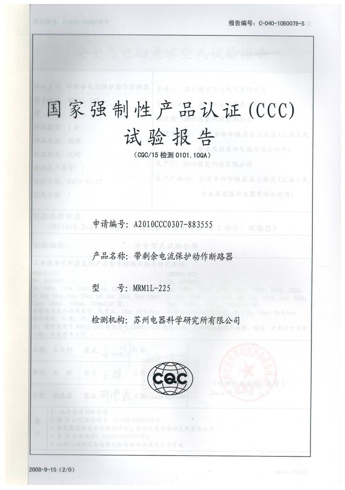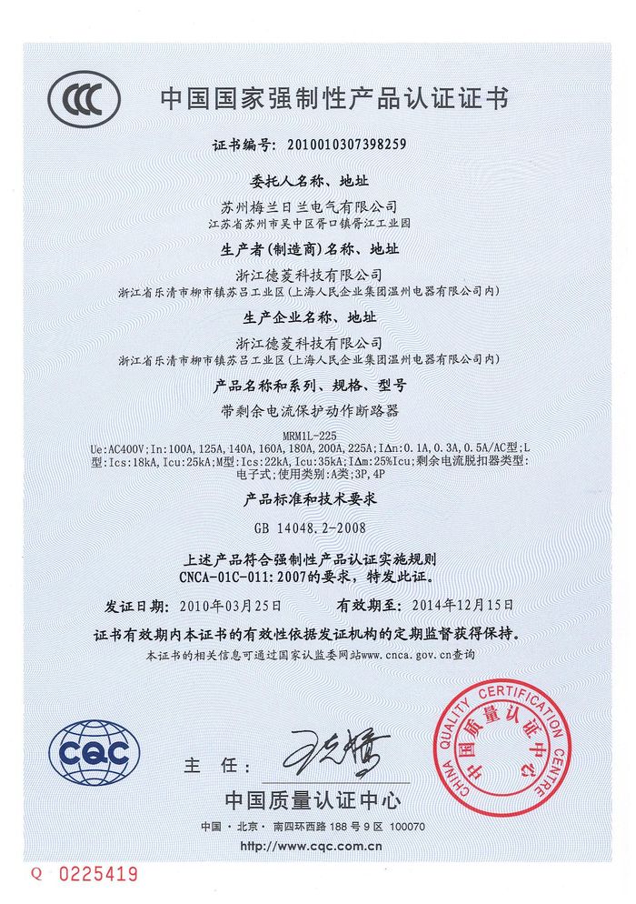 MRM1L-225塑殼漏電資質證書