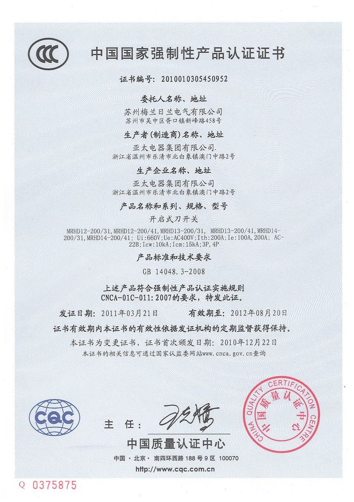 MRHD刀開關資質證書