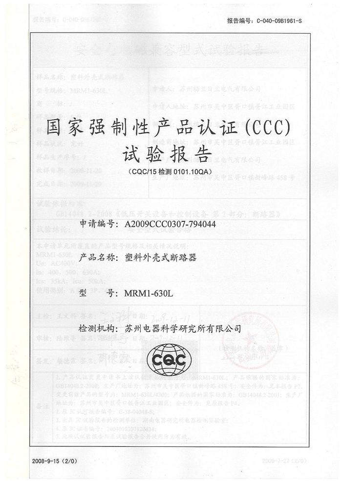 MRM1-630L塑殼短路器資質(zhì)證書(shū)
