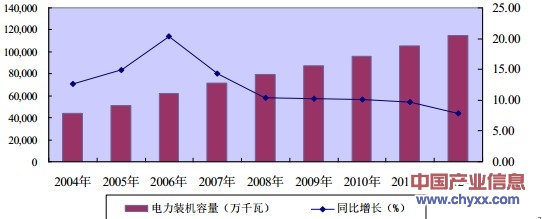 2004-2012年中國發(fā)電總裝機容量連續(xù)快速增長,“十一五”期間年均新增裝機容量近8,500萬千瓦,遠高于“十五”期間約4,600萬千瓦的年均新增容量。2012年發(fā)電總裝機容量達到11.45億千瓦,2015年,國內(nèi)發(fā)電機裝機容量將達到14.37億千瓦左右,將超過美國而躍居世界第一。