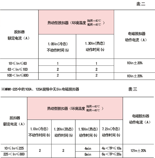斷路器熱動型脫扣器具有反時限特性;電磁脫扣器為瞬時動作,特性見表二(配電用)及表三(保護(hù)電動機用)