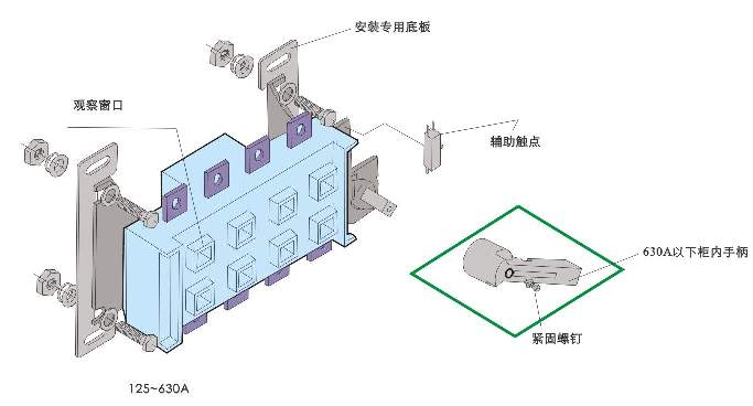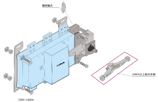 柜內(nèi)操作;手柄安裝在開關(guān)右側(cè)。