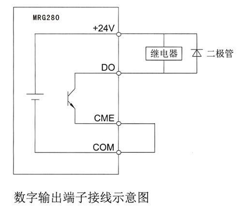 注2:數字輸出地CME與數字輸入地COM是內部隔離的,但出廠時CME與COM已經外部短接(此時D01默認為+24V驅動)。當D01想用外部電源驅動時,必須斷開CME與COM的外部短接。